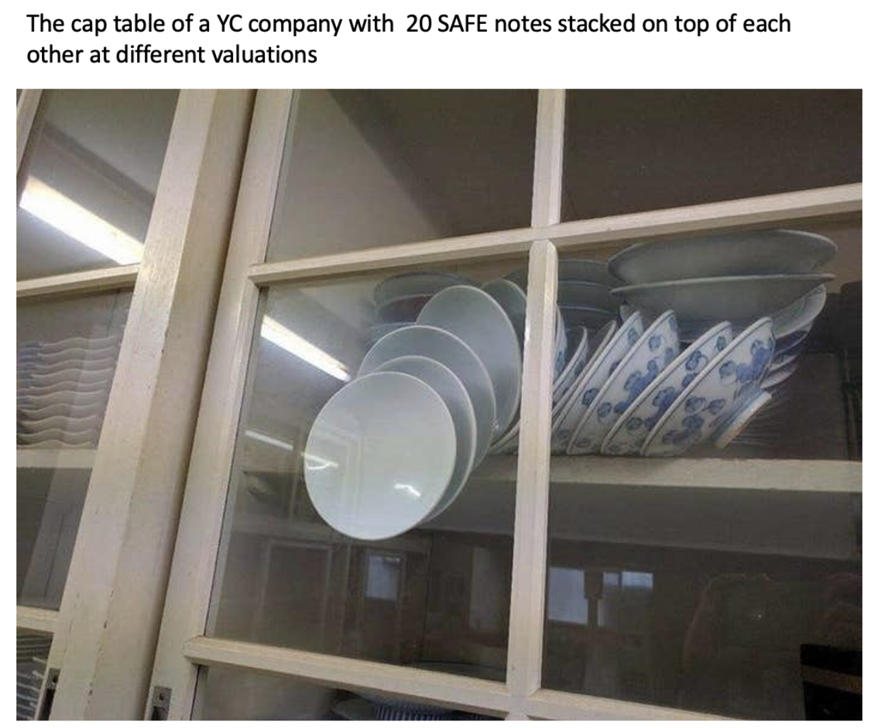 These days we’ve also seen a lot of stacking convertible/SAFE notes with valuations that keep changing. This isn’t a total deal breaker, but can be very challenging to figure out how much you own if this is overly complicated in the early stages.