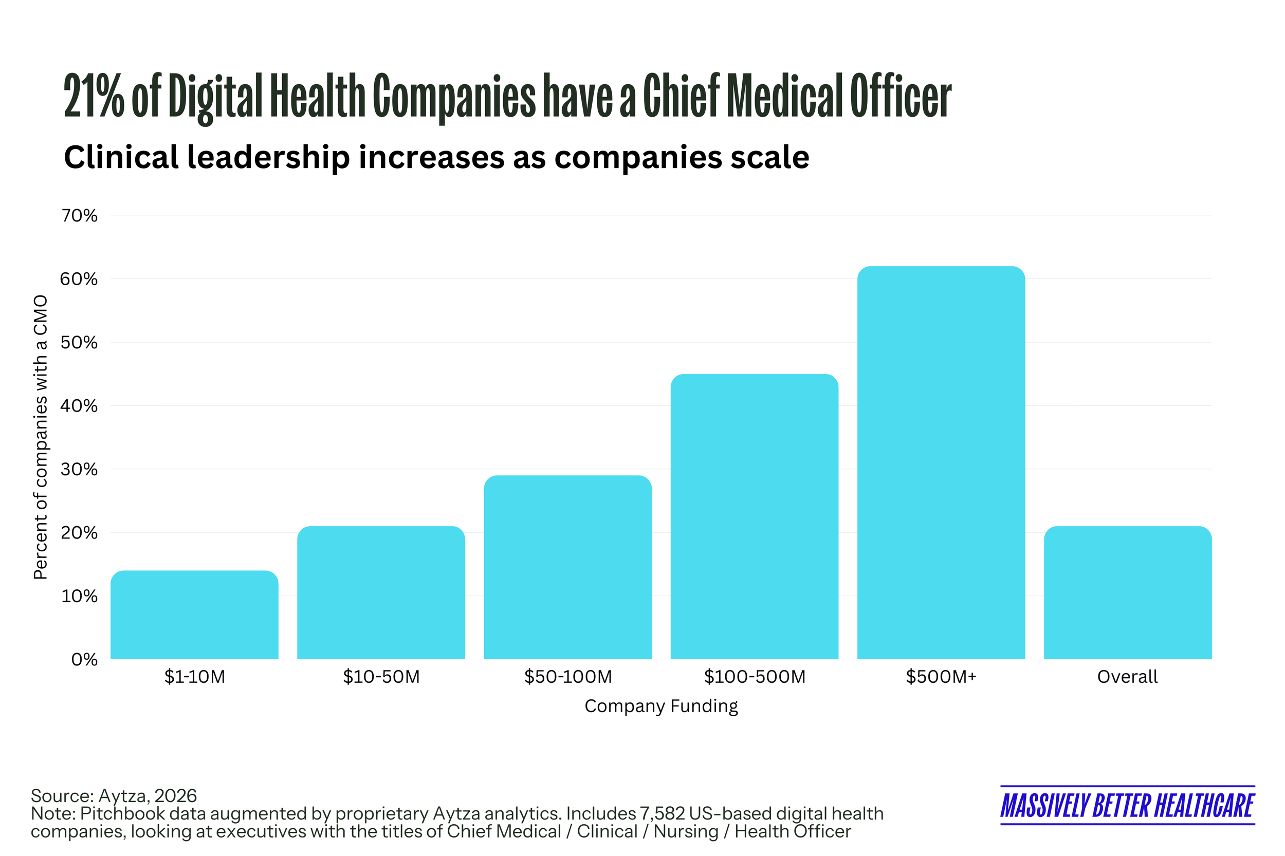 Today, 21% of U.S.-based digital health companies have executive clinical leadership, including a Chief Medical, Nursing, Clinical, or Health Officer. The share increases steadily with more funding: 14% of companies that have raised $1–10 million have a clinical leader, compared with 21% at $10–50 million and 29% at $50–100 million. Among companies that have raised $100–500 million, 45% have clinical leadership, rising to 62% for those that have raised more than $500 million. The data, from our friends at Aytza, suggest that formal clinical oversight becomes far more common as companies mature and operate at greater clinical, regulatory, and enterprise complexity.
