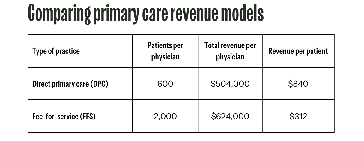 I worked with Dr. Sandeep Palakodeti, Faraan O. Rahim, and Pooja Lalwani to model out what a pure DPC practice could like compared with fee-for-service (FFS) primary care (we published a paper on it here).