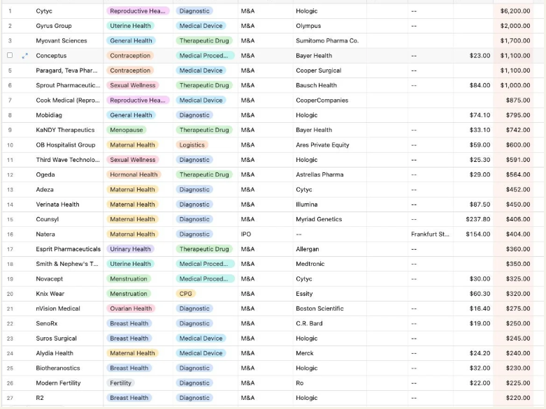 There are even more M&A transactions with undisclosed amounts including Ovia Health (LabCorp), Natalist (Everly Health), Naytal (Maven), Nurx (Thirty Madison), and Gennev (Unified Women’s Health).