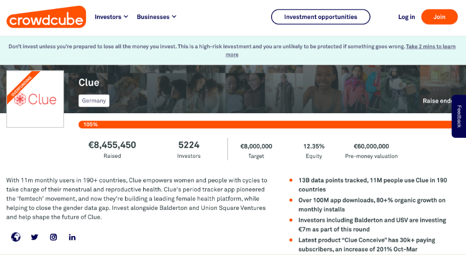 Startup Clue set a record for the number of investors as well as female investor participation on Crowdcube. They were able to crowdfund €8.5 ($9.2M) from 5,224 investors. Co-CEO Carrie Walter told Forbes, “It’s a real community moment - we hope that the crowd investors who also use Clue will become even more engaged in helping us develop the app in future.”