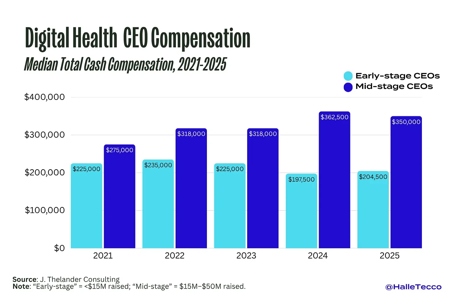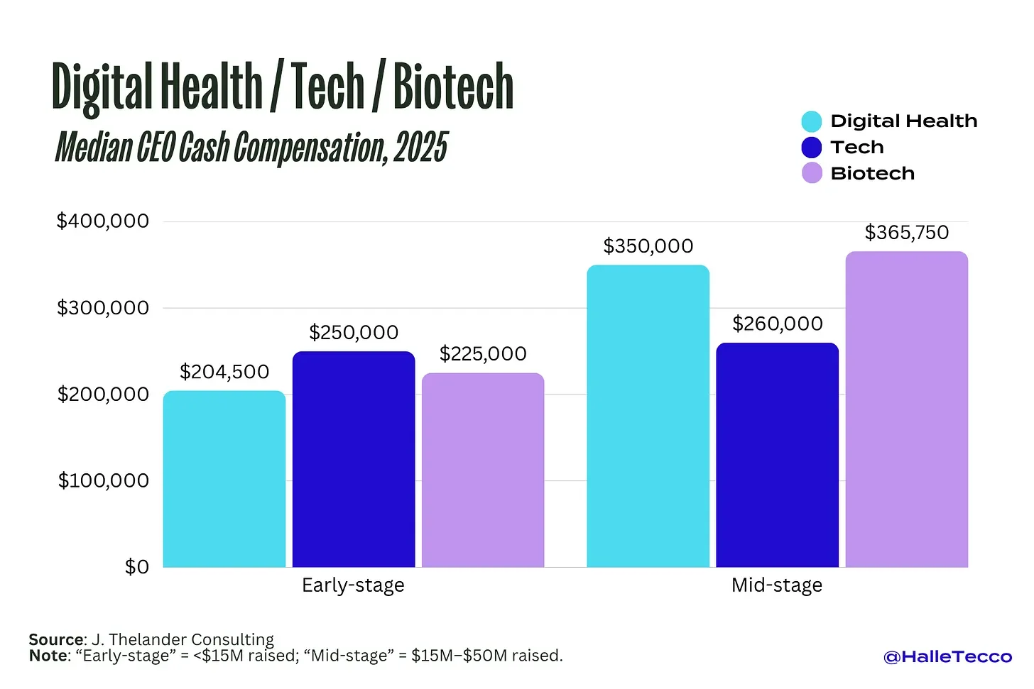 So how does digital health stack up against other sectors? At the early stage, digital health CEOs earn the lowest median salary at $204,500, compared to $225,000 in biotech and $250,000 in tech. But by the mid-stage, that flips: digital health CEOs earn $350,000—more than their peers in tech ($260,000) and only slightly behind biotech ($365,750).