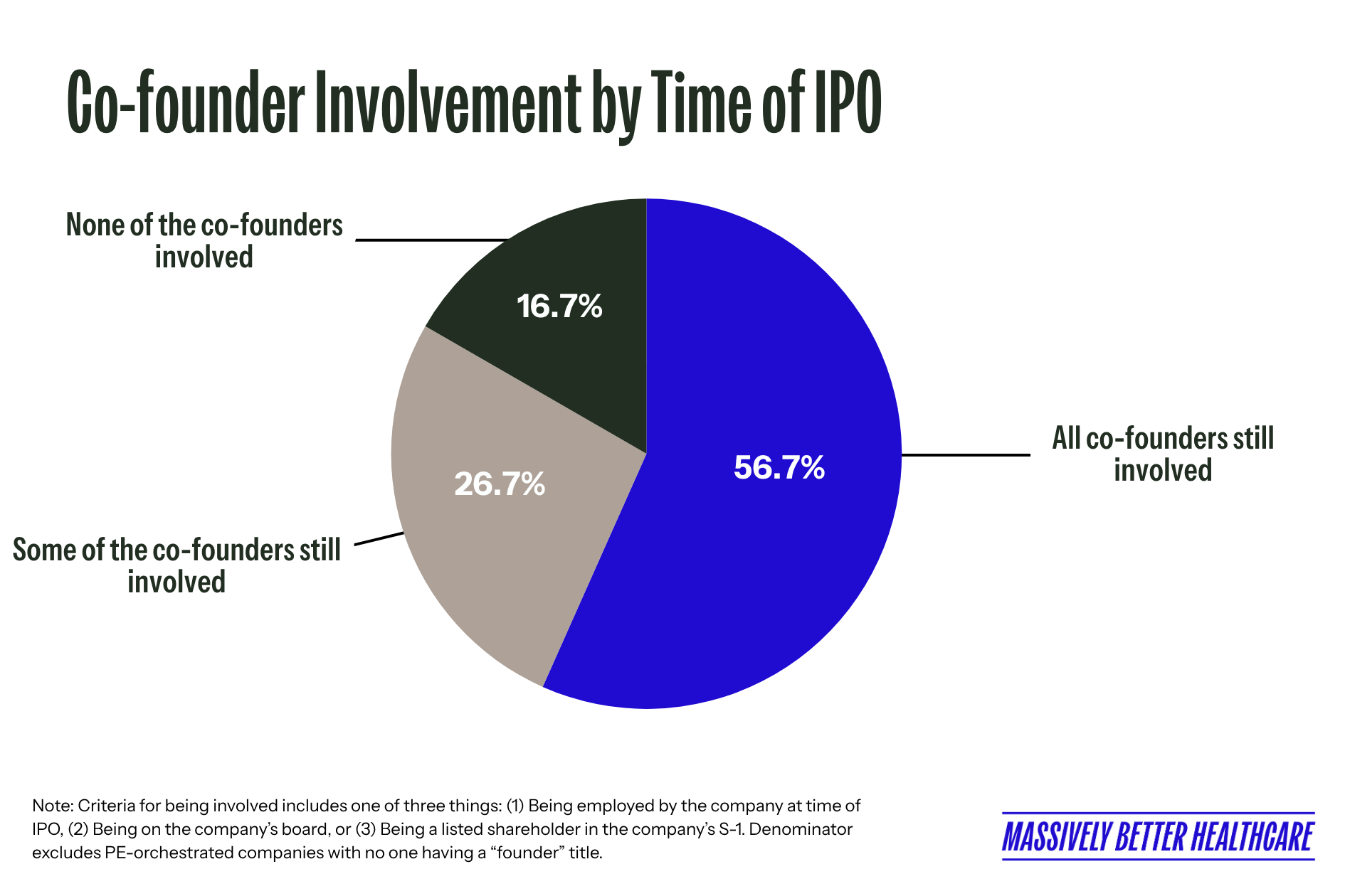 This is not uncommon. In about 1 in 6 of the companies, none of the founders were involved at IPO (as an employee, board member, or shareholder listed in the S-1). In about a quarter of the companies, at least one co-founder had left. And in 57% of the cases, the entire founding team was still involved in some way.