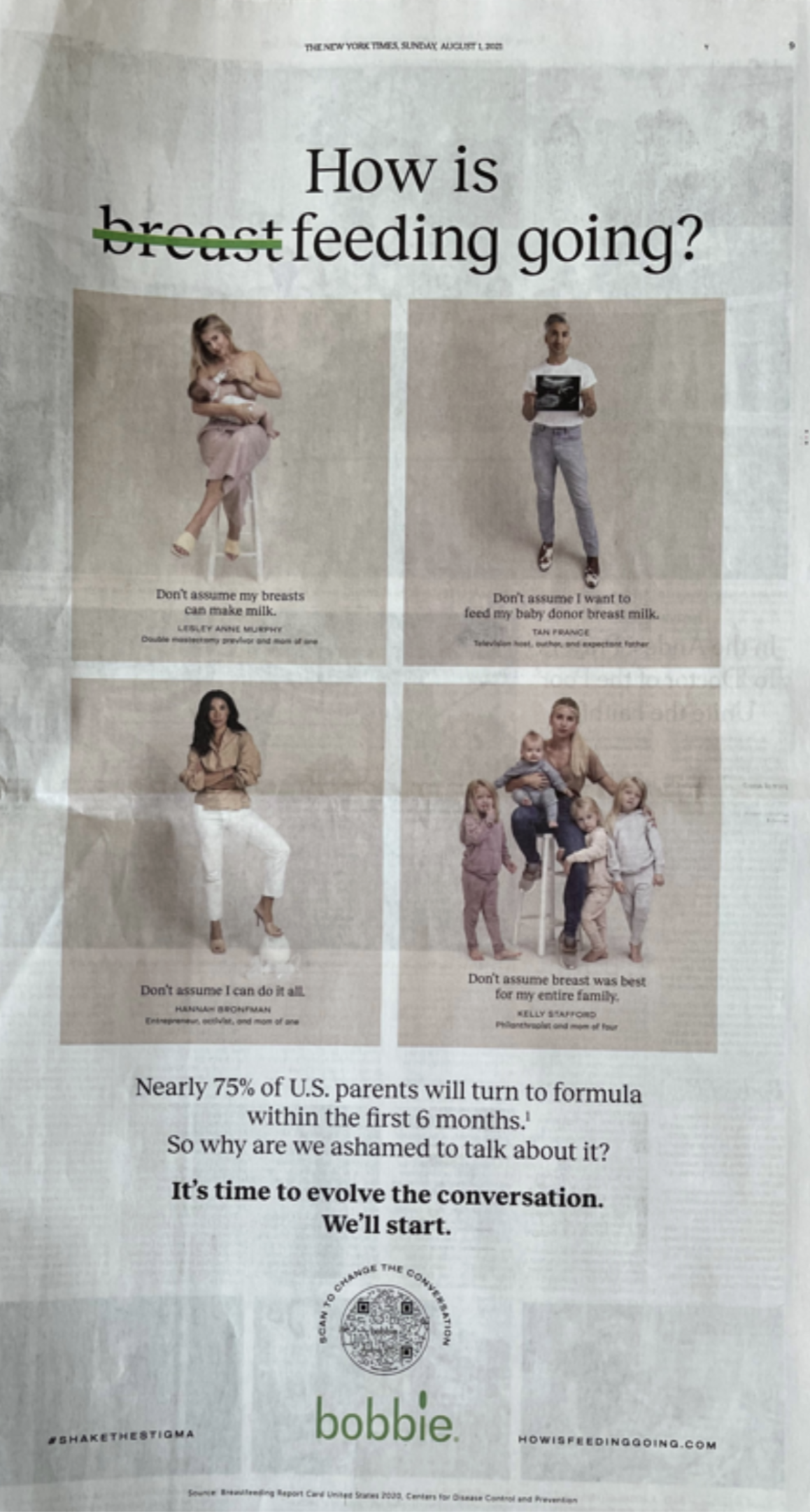 I’m constantly impressed with the brand team at Bobbie, an infant formula company. In 2021, they took out a full-page ad in the Sunday New York Times to combat the stigma against bottle feeding. They set out to evolve the conversation around how parents feed their babies. In doing so, they were speaking up for their customers: parents via surrogacy, same sex parents, adoptive parents, mastectomy moms, working moms, and those who choose to bottle feed for a variety of reasons.