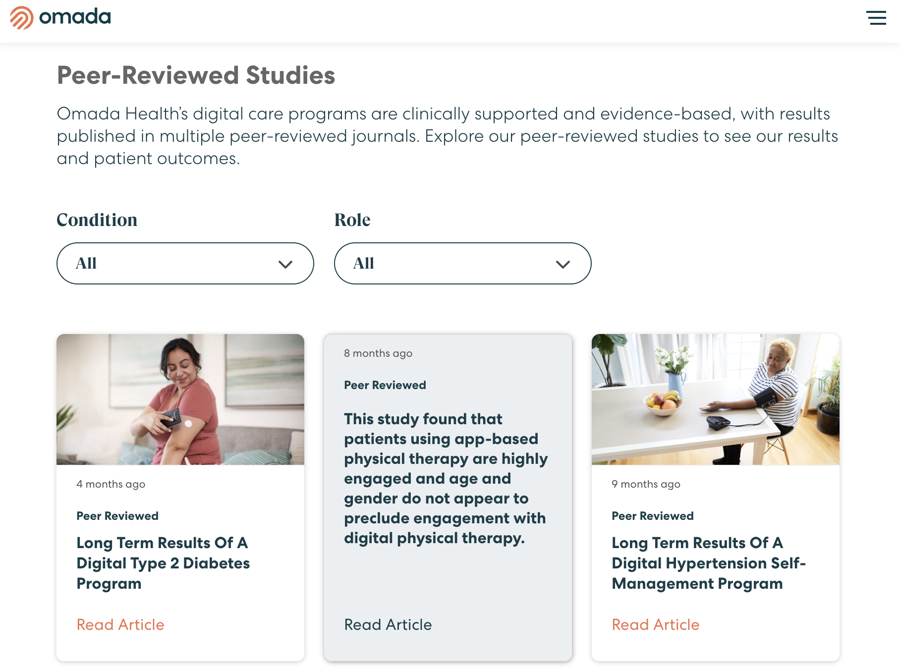 Omada Health is a great example of a startup that is constantly building and sharing evidence. Not only do they constantly publish peer-reviewed papers, but they have an entire portion of their website dedicated to it!