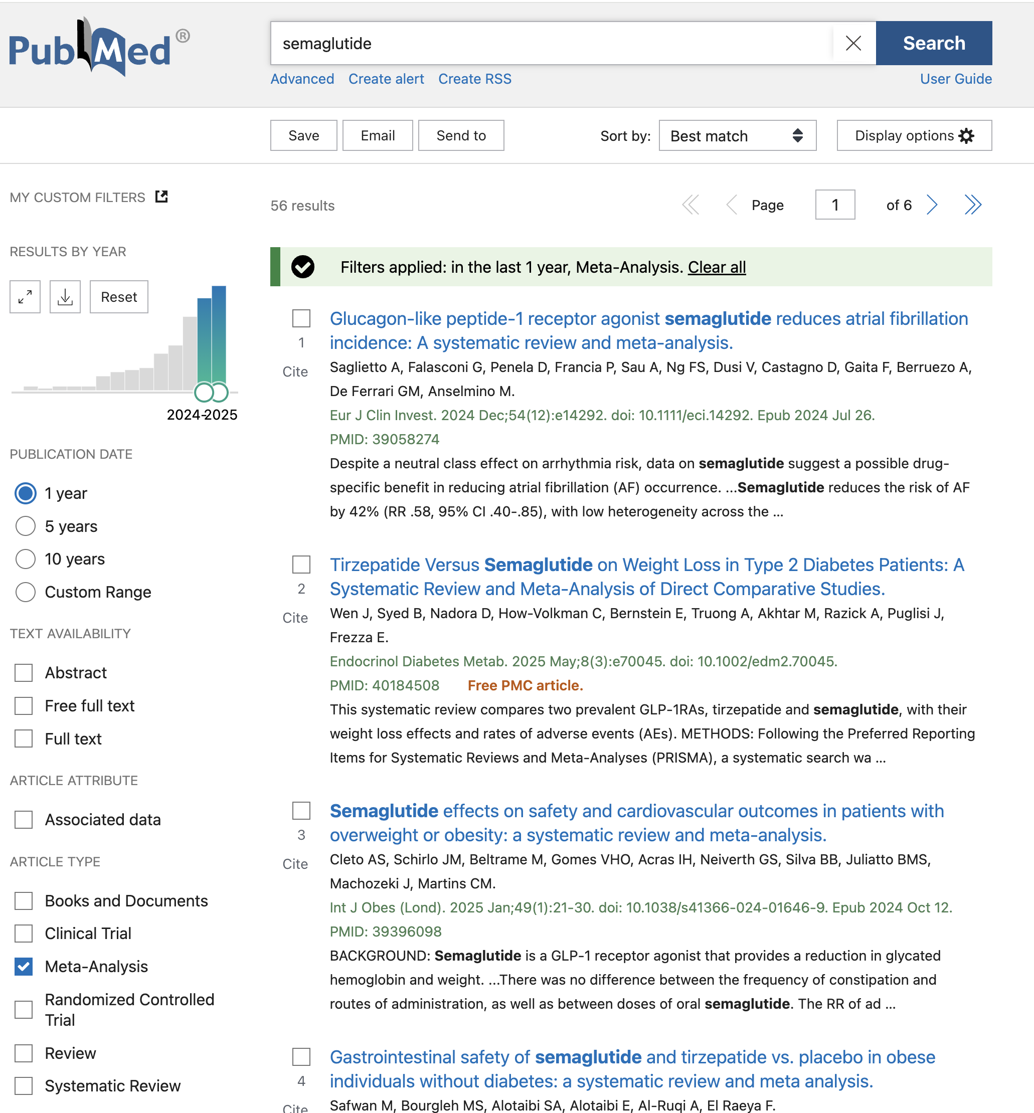 I always start with PubMed. Let’s say you’re looking at a startup prescribing GLP-1s (semaglutide) for obesity and want to know if this is even a legit drug. I would search semaglutide and start with any meta-analyses (I’ll explain more on that later). In this case, there are 56 results from 2024-2025.