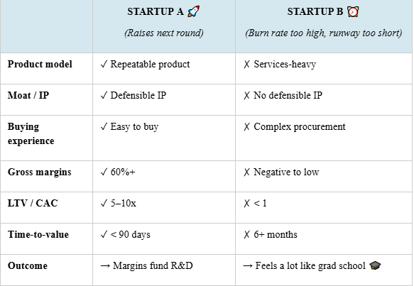 Repeatable product with defensible IP. Easy to buy. Throws off fat margins that fund R&D. LTV/CAC is enormous — 5x, 10x, higher.