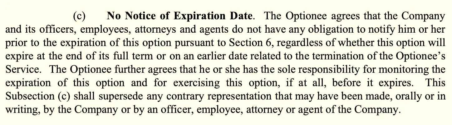 Most stock agreements also make clear that the company isn’t required to remind you when the clock starts ticking. So you miss it, that’s on you.