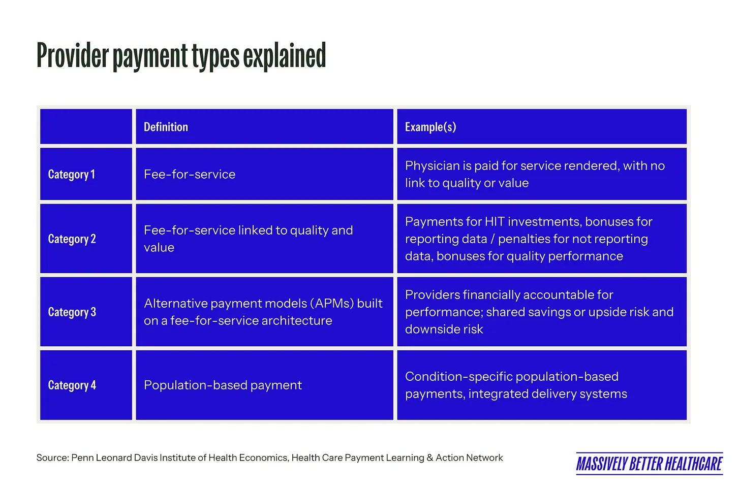 VBC is the overarching concept of designing care models to focus on quality, provider performance, and the patient experience. There are a lot of fancy terms and acronyms thrown around in this space, so let’s go over them. Note that a lot of these definitions sound similar, and that’s because they are.