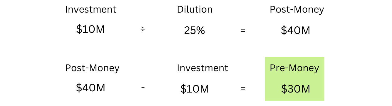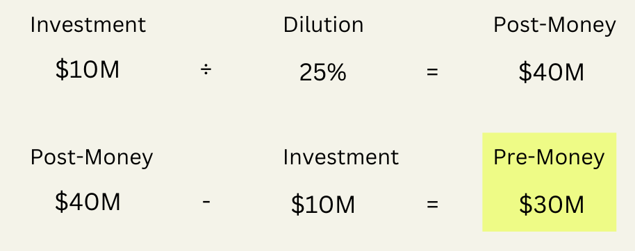 Thus, if you know the investment and dilution, you can calculate the pre-money. Let’s assume you invest $10M to own 25% of a company; the implied pre-money is $30M.