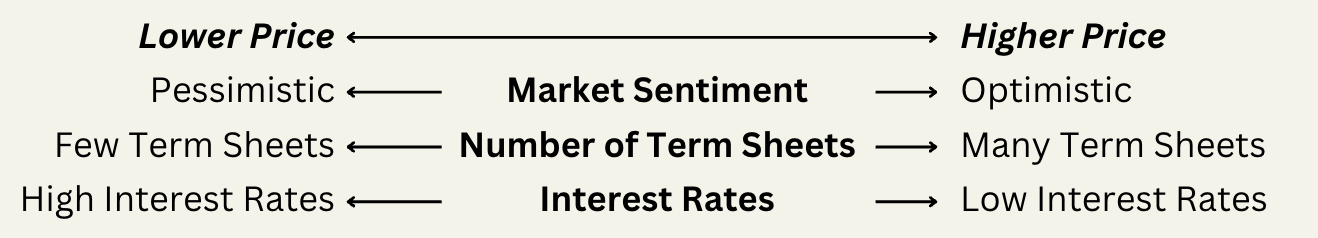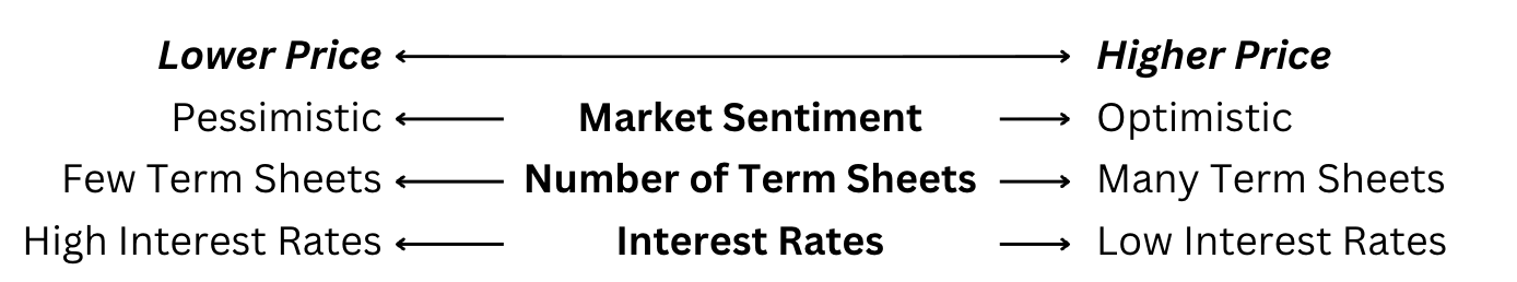 There are also several external factors that affect price, such as market sentiment, the number of term sheets, and the interest rate environment.