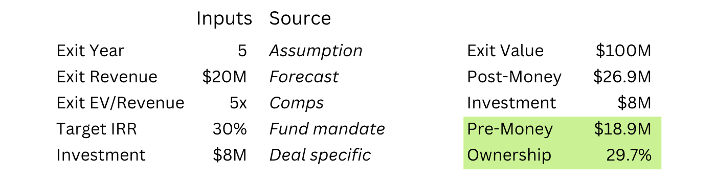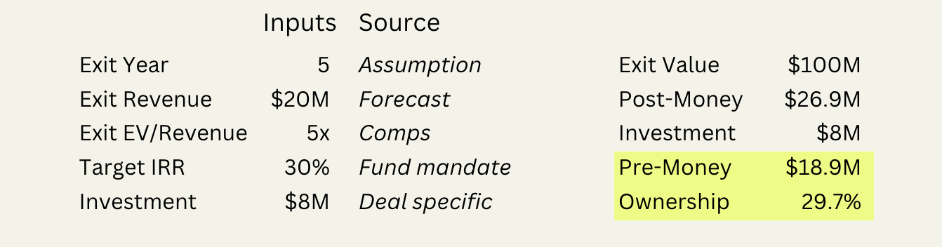 For example, suppose ABC Ventures is considering a $5M investment in TargetCo, which it thinks will exit at $100M in 5 years without any additional dilutive financing. Let’s also assume, using the methods outlined above, ABC Ventures and existing shareholders believe TargetCo is worth $30M (aka fair market value).