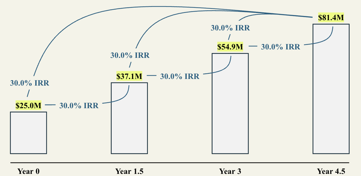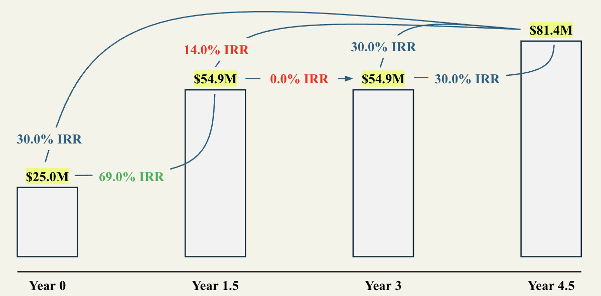 But what if low interest rates in year 1.5 cause investors to bid up the price? At first, this is great for existing shareholders who, on paper, realize a 69.0% return. However, assuming exit timing and value in year 4.5 hasn’t changed, this is not great for new investors who now only expect a 14.0% return.