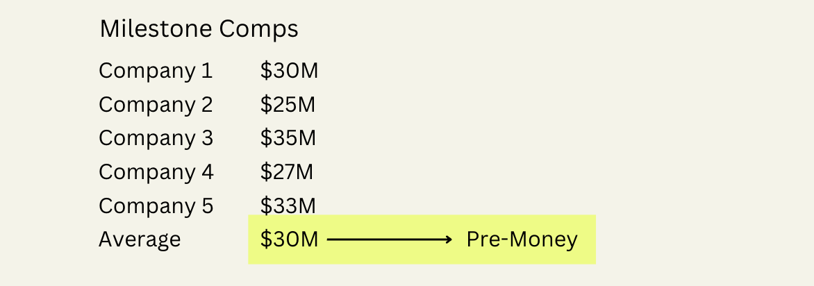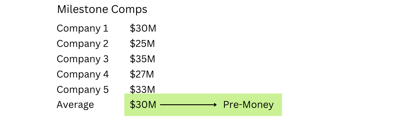 The Milestone Method calculates the pre-money by leveraging comparable company valuations at comparable milestones. Many industries have distinct developmental milestones (e.g., medical devices and therapeutics). If comparable companies raised around X after completing milestone Y, it is reasonable to assume that a company that just completed milestone Y could raise around X. Let’s assume comparable companies raised around $30M after completing milestone A. If we value a company that also completed milestone A, the pre-money should be roughly the same, $30M.