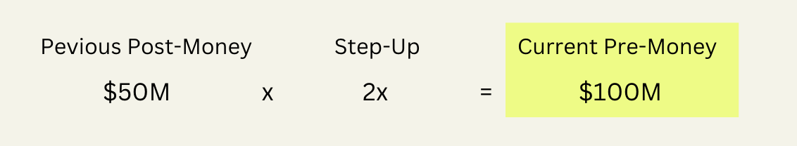The Step-Up Method calculates the current pre-money by multiplying the previous post-money by a multiple. When the multiple is >1x, it’s an up round (aka a step-up). When the multiple is <1x, it’s a down round (aka a step-down). When the multiple equals 1x, it’s a flat round.