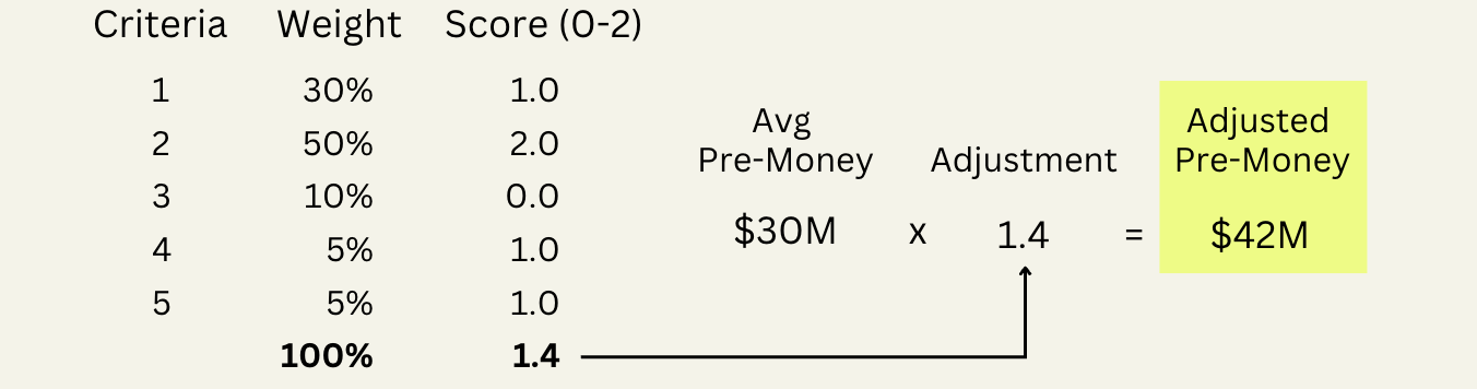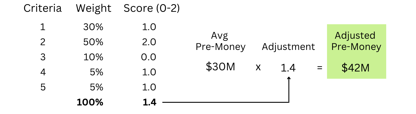 The Scorecard Method calculates the pre-money by multiplying the average value of comparable companies by an adjusted multiple. This approach builds on the milestone method while allowing for adjustments based on how a company compares to its peers. The scorecard method has four steps: