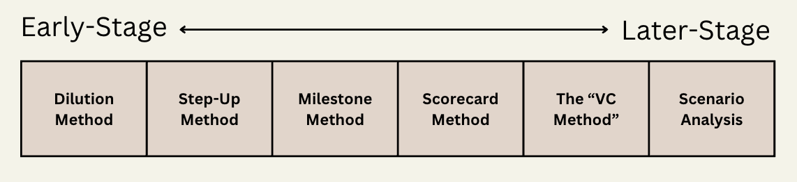 In conjunction with comparable valuation benchmarks, there are a handful of valuation methods used. It is also common for VCs to use several methods to triangulate a reasonable valuation. When deciding which method to use, it really depends on available information. If you are evaluating a later-stage deal with a lot of available information, it may be worth using a more involved method. If you are evaluating an early-stage deal with nothing more than a founding team and a business plan sketched on a napkin, a less involved method is more appropriate. And, to reiterate, the math is not complicated. In fact, these methods are more akin to simple frameworks. Below are six common valuation methods used in VC: