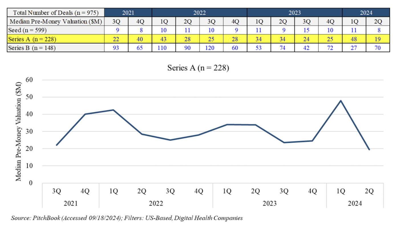 VCs will typically have a valuation range in mind for companies at various stages, which fluctuates with market conditions. The goal is to have a high-level sense of the current financing environment before entering company-specific data. For example, a VC evaluating a US-based digital health company raising its Series A may quickly pull together some derivation of the following analysis to set valuation expectations.