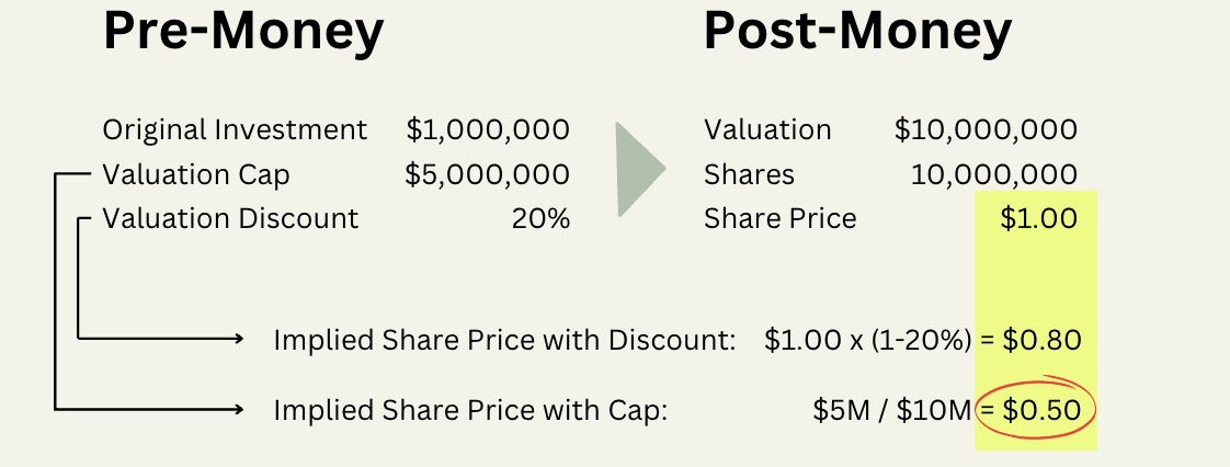 Let’s use an example. Suppose ABC Ventures invests $1M in TargetCo’s Seed round via a SAFE with a $5M cap and 20% discount. At this point, they really only have the promise to purchase shares in the future. During the next priced round, a new investor values TargetCo at $10M with a share price of $1.00. To calculate ABC Ventures’ implied share price using the cap, divide the $5M cap by the $10M valuation (i.e., $0.50 per share). To calculate ABC Ventures’ implied share price using the discount, multiply the $1.00 share price from the priced round by 1-20% (i.e., $0.80). Since the cap yields a lower share price, ABC Ventures will use this and obtain 2M shares in return for their $1M investment.