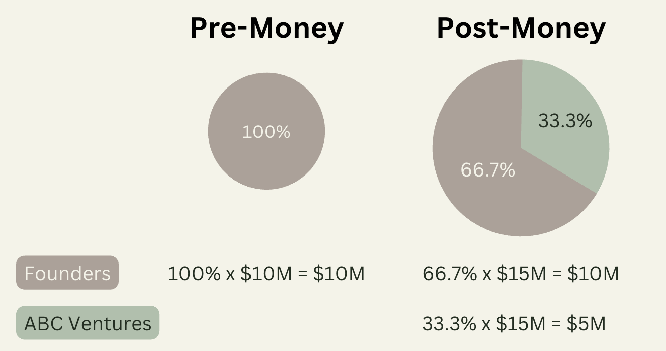 To start, let’s define key terms with an example. Suppose ABC Ventures invests $5M into TargetCo at a $10M valuation (more on how they might have come up with that valuation later). The pre-money valuation is the company's valuation before funding, so $10M and the post-money valuation is the valuation after funding, so $15 ($10M pre-money plus the $5M investment).